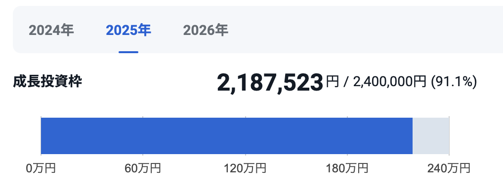 暴落が来たら買おうと思っていたのですが、今年は調子の良い時期が多く慎重になりすぎて、成長投資枠を埋めきれませんでした。